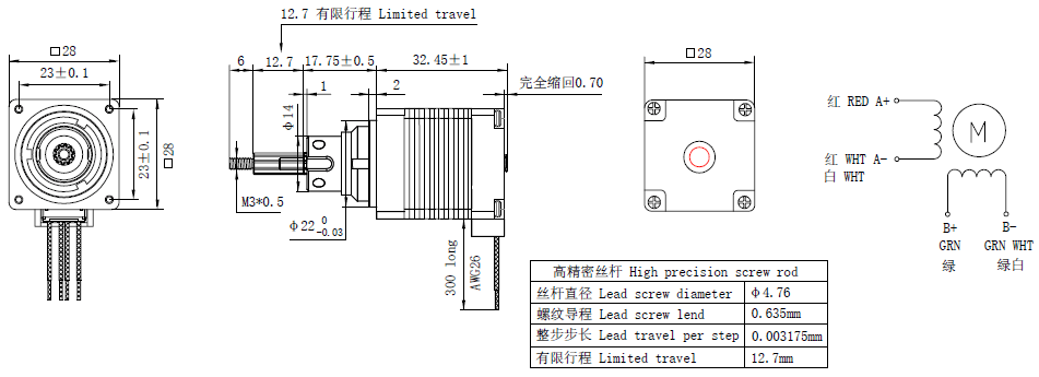 This Captive linear actuator electric motor is one size 28mm NEMA 11 linear motion stepper motor with a 32mm body length, 1.8 degree step angle, and 0.5A rated current. It is integrated with a 4.76mm diameter lead screw & lead travel 0.635mm per revolution/0.003175mm per step, and the travel distance is 12.7mm.