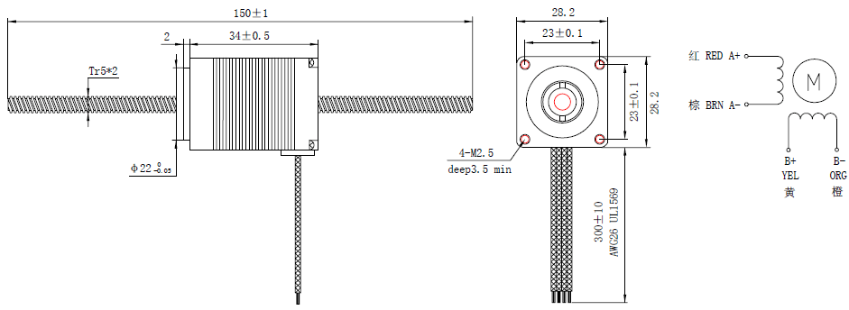 This NEMA 11 non-captive linear actuator stepper motor with body length 34mm is integrated with a diameter Φ5mm lead screw. The lead travel is 2mm per revolution or 0.01mm pre step