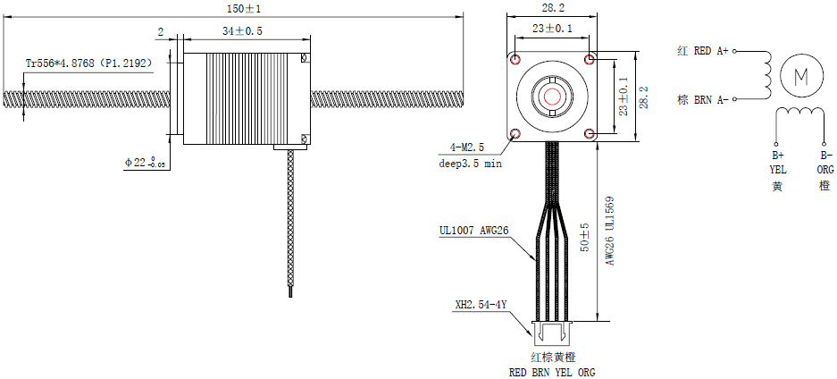 NEMA 11 Linear Actuator Stepper Lead 4.8768mm: This size 28mm linear actuator motor is a NEMA 11 Non-captive type lead screw linear actuator stepper motor with a single stack (34mm body length), 1.8 degree step angle and 0.75A rated current. It is integrated with a Φ5.56mm diameter, 150mm lead screw length, and the linear travel is 4.8768mm per revolution/0.024384mm per step.