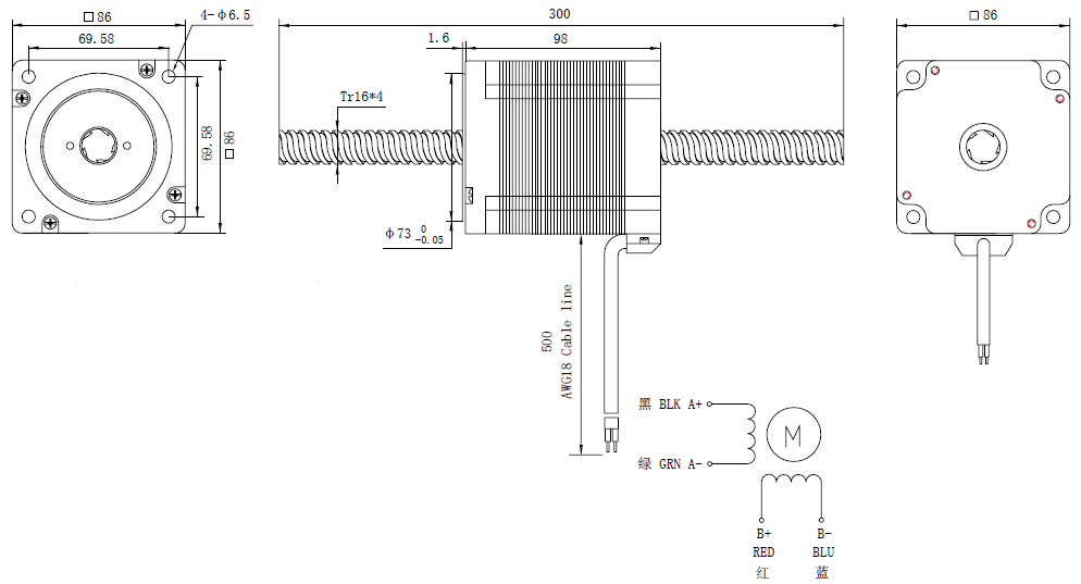This non-captive linear actuator electric motor is one size 86mm NEMA 34 linear motion stepper motor with a 98mm body length, 1.8 degree step angle and 6.0A rated current. It is integrated with a 16mm diameter, 300mm length lead screw, and the linear travel is 4mm per revolution/0.02mm per step.