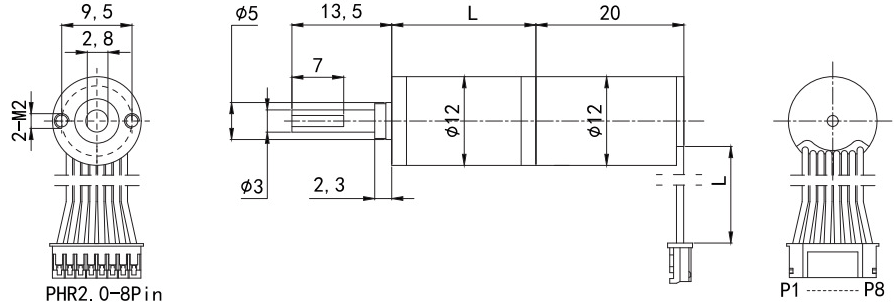L=22mm, P1-P5 Hall Sensor Wiring, P6-P8 Motor Wiring