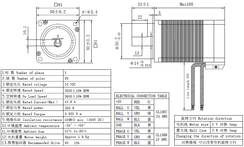 This size 60mm electric motor is a standard 24 voltage brushless DC motor, which generates a high power 300W and a strong torque 0.95Nm at RATED speed 3000RPM. It is suitable for textile machines, robotics, autobikes, cooling fans, pumps and other industrial applications or household appliances.