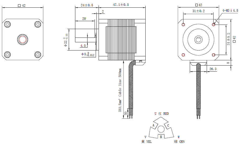3 Phase NEMA 17 Stepper Motor 1.2deg 1.5A 0.32Nm/45.44oz.in 42x47mm 3 Wires