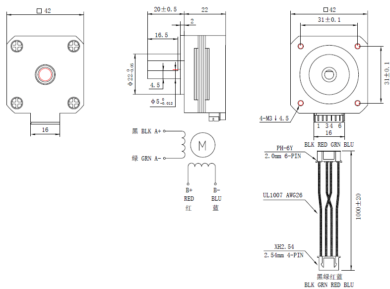 This NEMA 17 stepper motor with 22mm body length has holding torque 0.16Nm/22.72oz.in and 1.0A rated current each phase. A JST XH 2.54mm 4 Pin connector is assembled at the terminal of the wires.