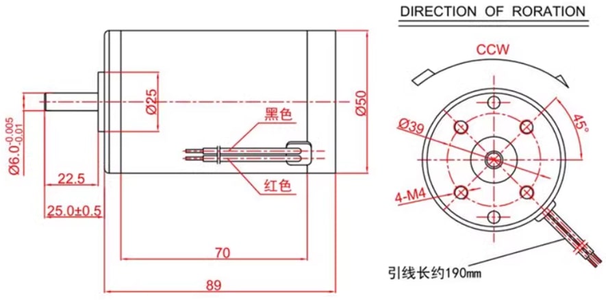 This size 50mm electric motor is a standard 24 voltage brushed permanent magnetic DC motor. It generates a power 10W and a rated torque 0.09Nm at 1500RPM.