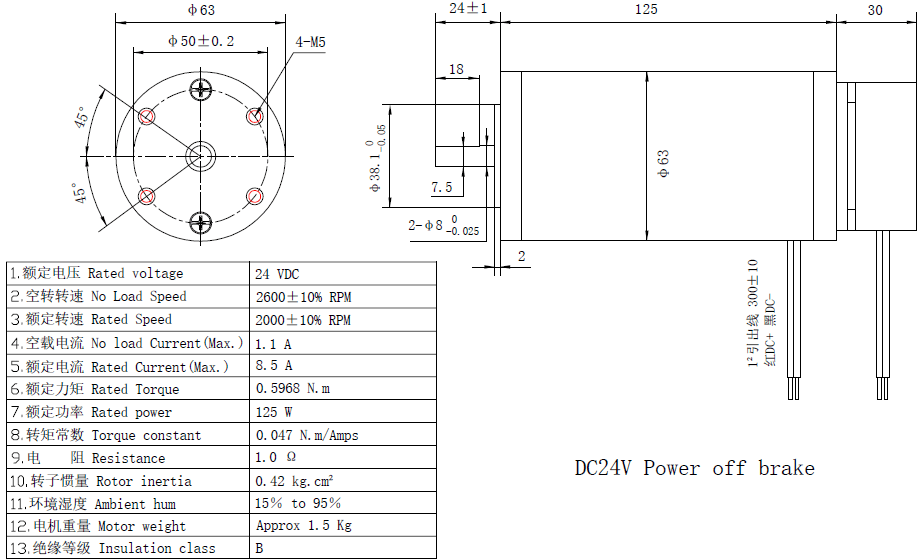 This size 63mm electric motor is a standard 24 voltage brushed DC motor with double shaft. It generates a high power 125W and a strong torque 0.6Nm at 2000RPM. A 24V electromagnetic brake is assembled for special applications.