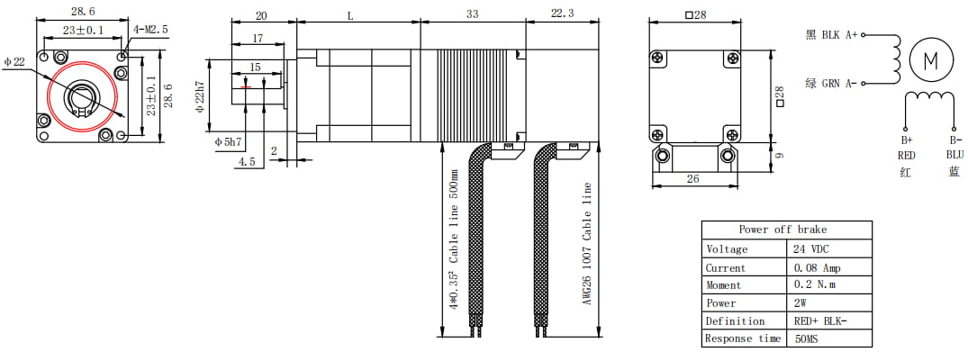 This small size 28mm NEMA 11 geared stepper motor 1.8deg step angle with 33mm body length has a good holding torque output 0.07Nm/9.94oz.in, which is combined with a 24V electromagnetic brake & a gear ratio of 50:1 high precision low backash square planetary gearbox. It is absolutely an ideal solution the applications require vertical operation and low speed/high torque output.