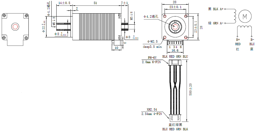 This small size 28mm NEMA 11 hollow shaft stepper motor has a body length 51mm with 1.0A rated current & holding torque 0.14Nm/19.88oz.in. A hollow shaft with outer diameter Φ8.0mm & inner diameter Φ4.2mm is available and also a double shaft with a front shaft length 14mm and rear shaft length 7mm is designed.