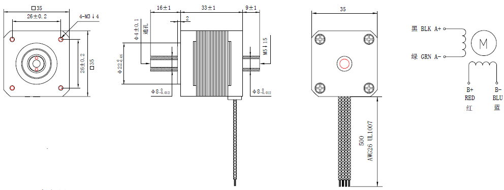 This popular size 35mm NEMA 14 hollow shaft stepper motor has a body length 33mm with 1.25A rated current & holding torque 0.16Nm/22.72oz.in. A hollow shaft with outer diameter Φ8.0mm & inner diameter Φ4mm is available and also a double shaft with front shaft length of 16mm & rear shaft length of 9mm is designed.