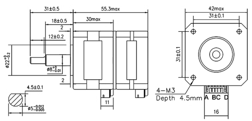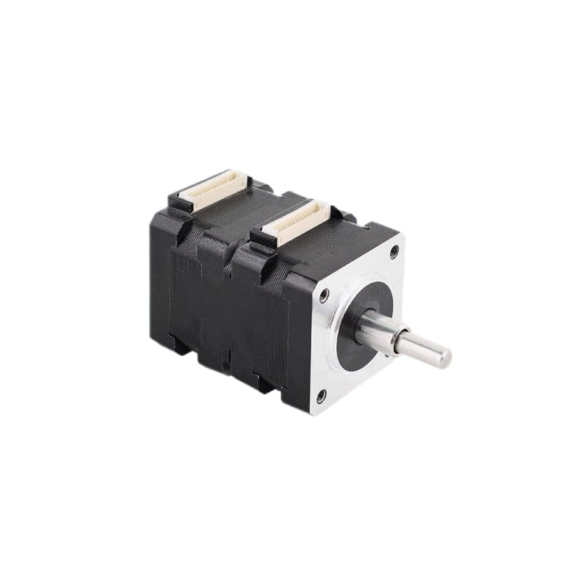 This NEMA 17 assembled stepper motor combines two small NEMA 17 stepper motors together so it has two output shafts: inner shaft and out shaft, which can achieve the motor's positive and negative rotation at the same time.