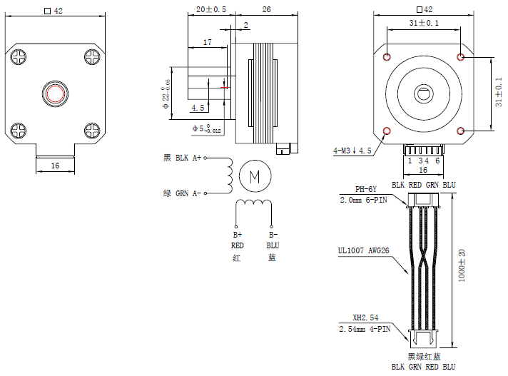 This bipolar NEMA 17 stepper motor has step angle 0.9deg(400 steps per revolution) with 26mm body length, each phase draws 1.4A with holding torque 0.18Nm/25.56oz.in, and it can be driven by 12-24VDC voltage for a good torque output with speed 0-1000RPM.