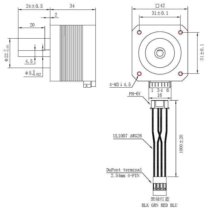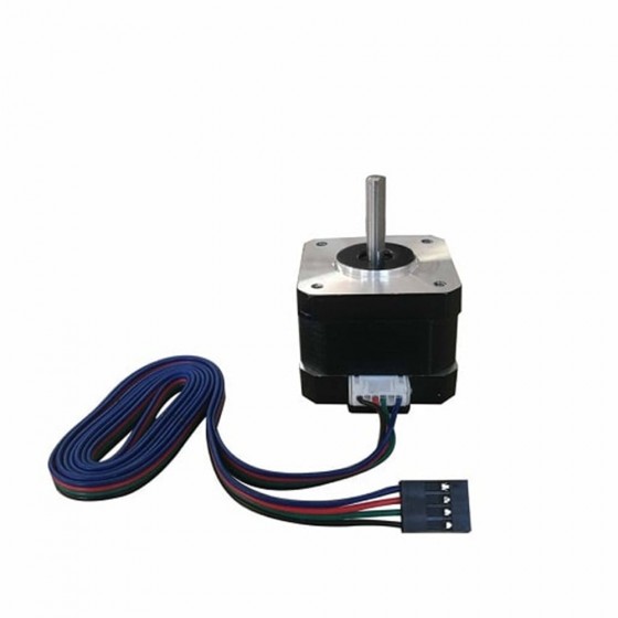 This bipolar NEMA 17 stepper motor is with step angle 1.8deg and size 42x42x34mm. It has 4 wires with 1m cable and 2.54mm pitch DuPont plug connector, each phase drawing current 0.4A at 12V, with holding torque 0.3Nm/42.6oz.in). This motor is an ideal choice for Desktop 3D Printers.