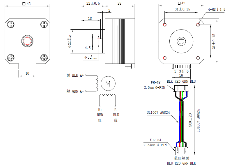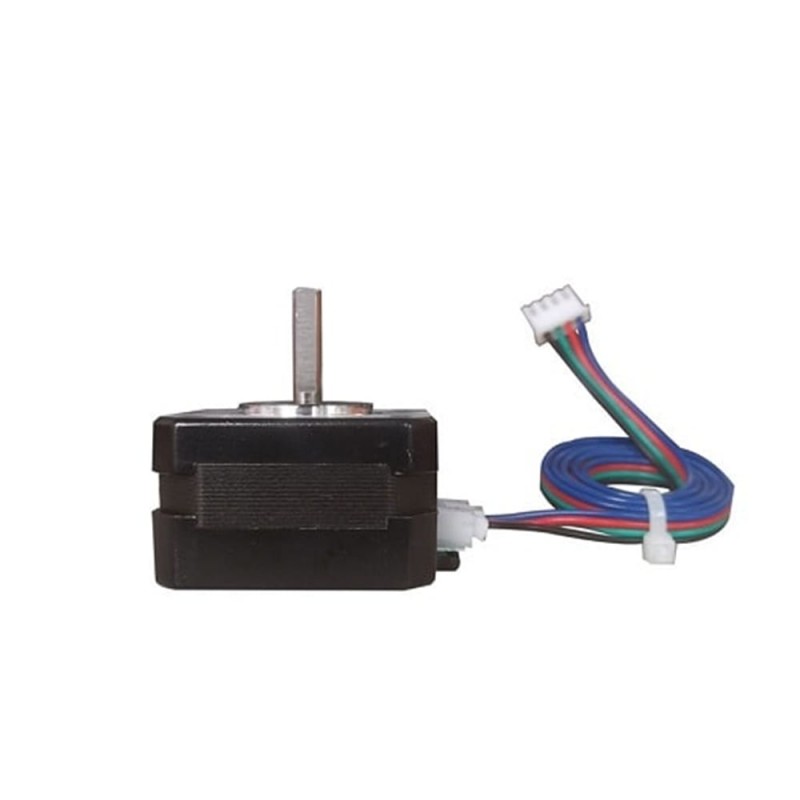 This is bipolar NEMA 17 stepper motor with step angle 1.8deg and size 42x42x28mm. It has 4 wires, each phase draws current 0.6A with holding torque 0.12Nm/17.04oz.in. A Dupont 2.54mm 4pin connector is fixed at the terminal of the wires.
