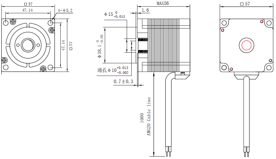 This big size 57mm NEMA 23 hollow shaft stepper motor has a body length 56mm with 2.8A rated current & holding torque 1.2Nm/170.4oz.in. A hollow shaft with outer diameter Φ15mm & inner diameter Φ10mm is available. A diameter Φ10mm lead screw can be mounted in this hollow shaft stepper.