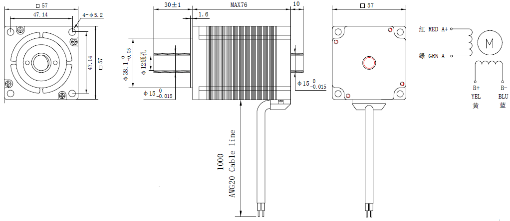 This big size 57mm NEMA 23 hollow shaft stepper motor has a body length 76mm with 4.2A rated current & holding torque 1.9Nm/269.8oz.in. A hollow shaft with outer diameter Φ15mm & inner diameter Φ12mm is available and also a double shaft with a long front shaft length 30mm and rear shaft length 10mm is designed.
