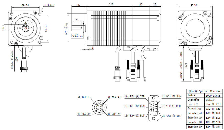 This size 86mm 2 phase NEMA 34 stepper motor with 1.8deg step angle has a strong torque output 12Nm/1704oz.in, which is combined with a 24V electromagnetic brake & 1000CPR incremental optical encocer. It is absolutely an ideal solution the applications require closed-loop servo control and vertical operation situation.