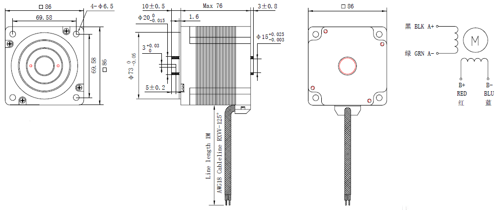 This big size 86mm NEMA 34 hollow shaft stepper motor has a body length 76mm with 6.0A rated current & holding torque 4.5Nm/639oz.in. A hollow shaft with outer diameter Φ20mm & inner diameter Φ15mm is available and also a double shaft with a short front shaft length of 10mm and rear shaft length 3mm is designed.