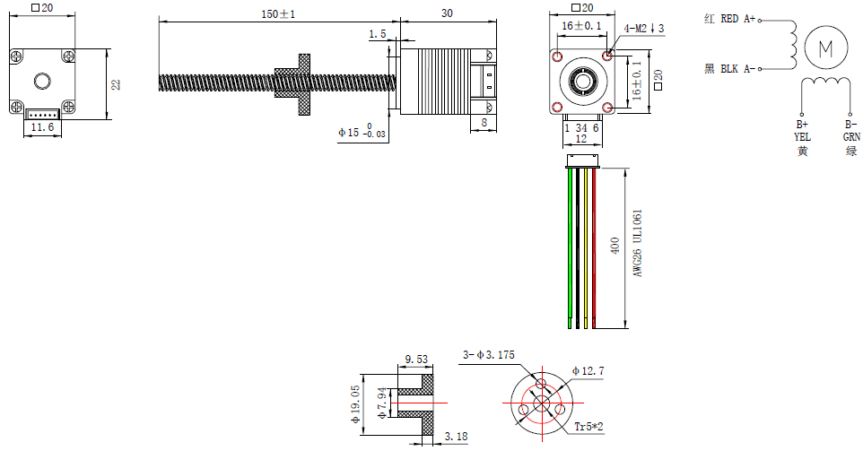 NEMA 8 External Linear Actuator Stepper Motor 30mm Stack 0.6A Lead 2mm Length 150mm