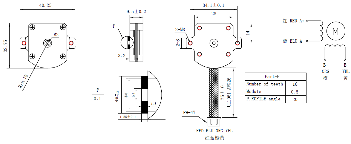 This NEMA 11 pancake stepper motors has one ultra thin body 9.5mm and 4 wires, each phase drawing 0.5A current with holding torque 0.016Nm/2.27oz.in. A 0.5 module 16 teeth gear is fixed into the output shaft.