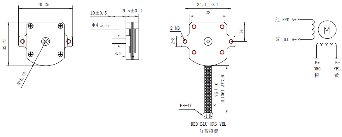 This size 28mm pancake NEMA 11 stepper motor has a ultrathin body length 9.5mm, each phase draws 0.5A current and 0.016Nm/2.27oz.in holding torque. A diameter Φ4mm with length 10mm output shaft is available.