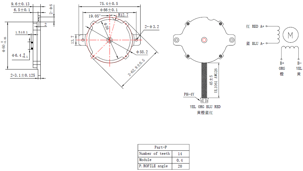 This NEMA 23 pancake stepper motors have one thin body 9.6mm and 4 wires, each phase drawing current 0.8A with holding torque 0.06Nm/8.5oz.in. A 14 Teeth 0.4 module gear is fixed into the output shaft.