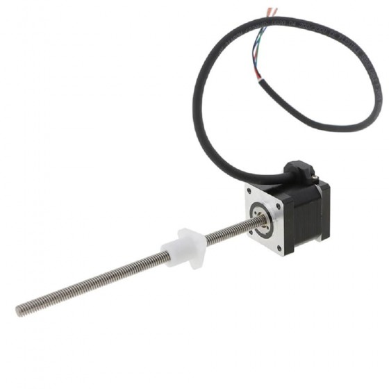 This size 42mm (NEMA 17) External type lead screw stepper linear actuator with single stack provides high performance, a long operation cycle, and offers upto 320N of continuous thrust. It is integrated with with a Φ6.35mm diameter 150mm length lead screw and a POM screw nut. The lead screw's linear travel is 6.35mm per revolution or 0.03175mm per step.