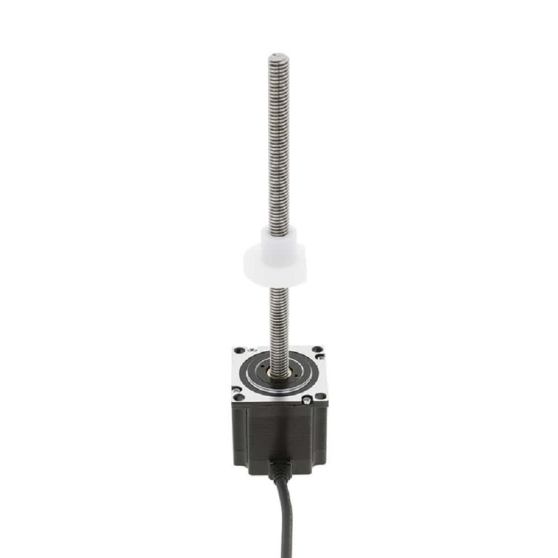 This size 57mm (NEMA 23) External type lead screw stepper linear actuator with single stack provides high performance, a long operation cycle, and offers upto 910N of continuous thrust. It is integrated with with a Φ9.525mm diameter 150mm length lead screw and a POM screw nut. The lead screw's linear travel is 12.7mm per revolution or 0.0635mm per step.