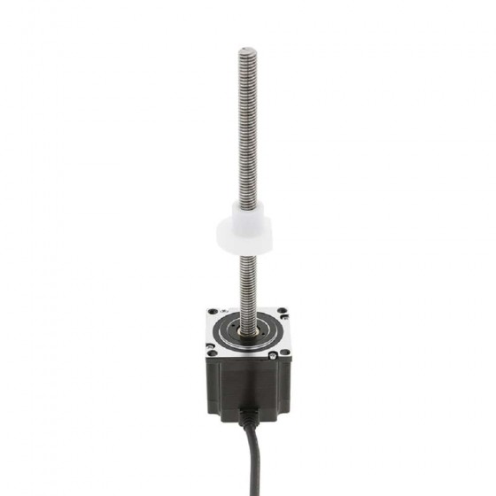 This size 57mm (NEMA 23) External type lead screw stepper linear actuator with single stack provides high performance, a long operation cycle, and offers upto 910N of continuous thrust. It is integrated with with a Φ9.525mm diameter 150mm length lead screw and a POM screw nut. The lead screw's linear travel is 3.175mm per revolution or 0.015875mm per step.